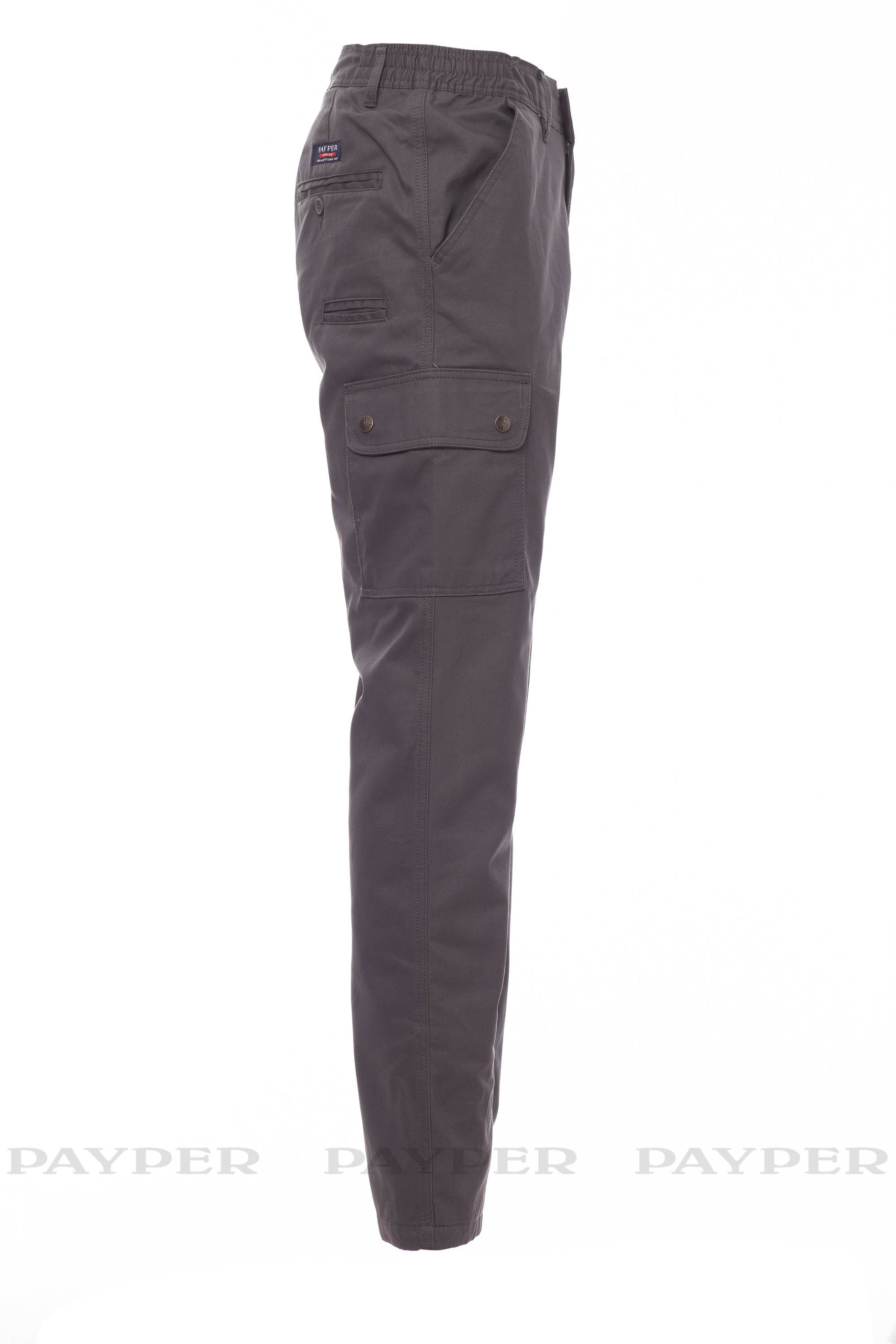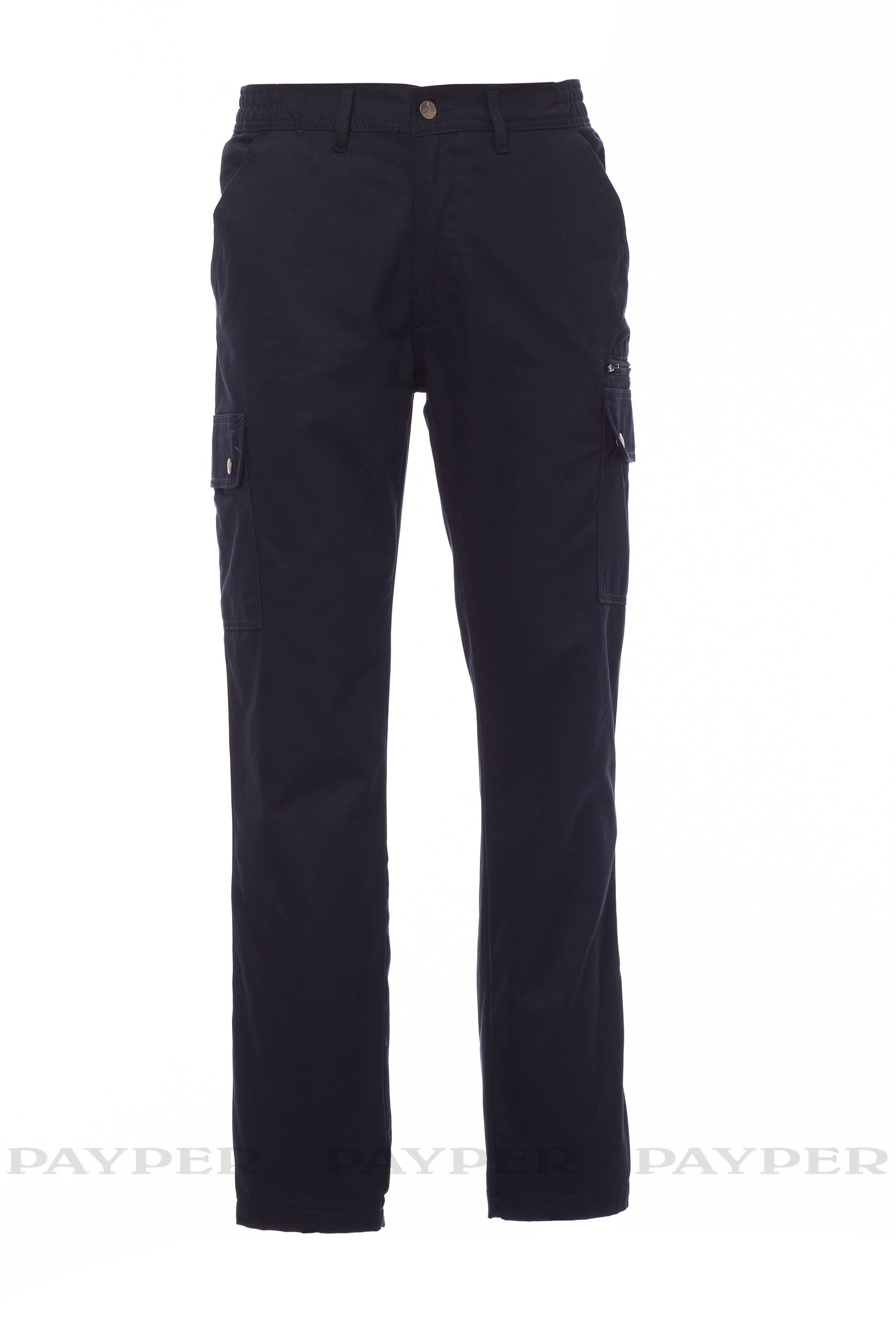 Winter-Herrenhose mit Futter aus Polyesterflanell (Gewicht 110 g/m²), seitlich dehnbarer Bund, Hosenschlitz mit Metallreißverschluss und -knopf, 2 klassisch geschnittene Vordertaschen, 2 Cargotaschen mit Patte und Druckknöpfen, 1 Reißverschlusstasche links, 1 versteckte Zollstocktasche rechts, 2 Gesäß-Leistentaschen mit Knopf und Knopfloch. Die eigentliche Cargohose ist aus 100% Baumwolle mit 280 gr. Twillgewebe.